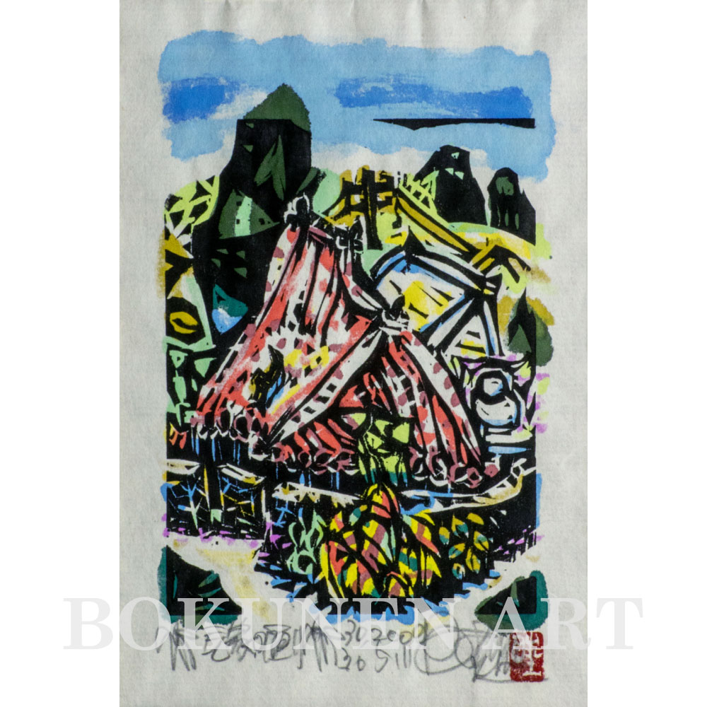 彩色までも版によって行う浮世絵とは違い、ボクネンの手で1点ずつ着色が行われます。そのため、同じ絵柄を何枚も作成できる版画ではあっても、全く同じ色合いの作品はありません。また、和紙の繊維の間から滲み出した色は、表面から直に着色するよりも自然な味わいがあります。