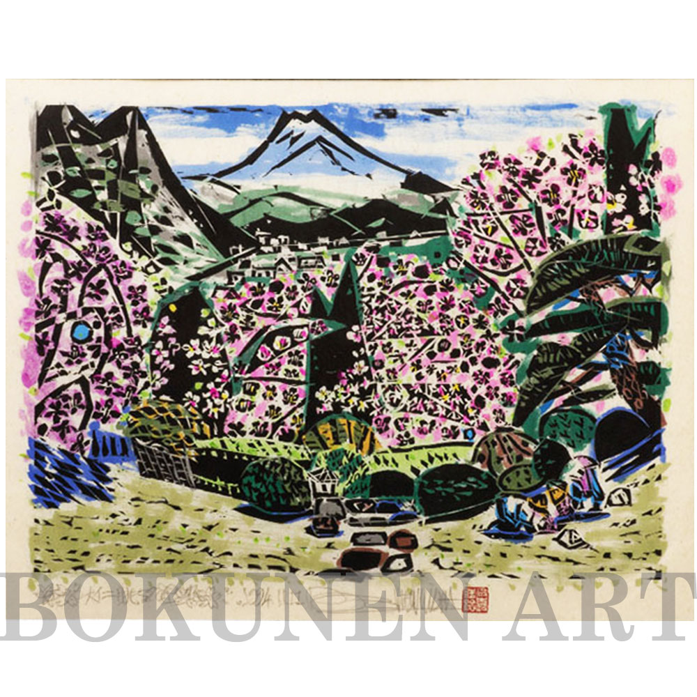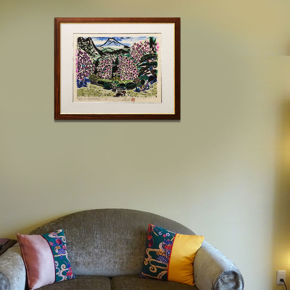 彩色までも版によって行う浮世絵とは違い、ボクネンの手で1点ずつ着色が行われます。そのため、同じ絵柄を何枚も作成できる版画ではあっても、全く同じ色合いの作品はありません。また、和紙の繊維の間から滲み出した色は、表面から直に着色するよりも自然な味わいがあります。