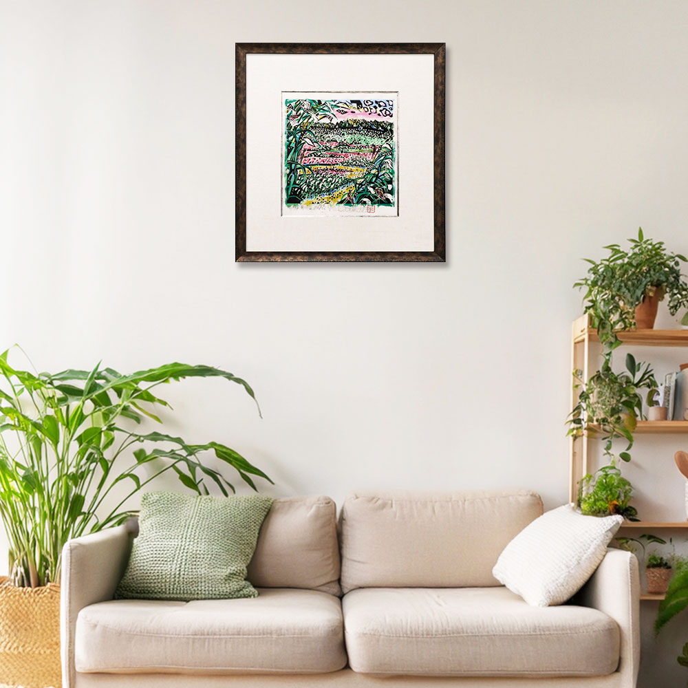 彩色までも版によって行う浮世絵とは違い、ボクネンの手で1点ずつ着色が行われます。そのため、同じ絵柄を何枚も作成できる版画ではあっても、全く同じ色合いの作品はありません。また、和紙の繊維の間から滲み出した色は、表面から直に着色するよりも自然な味わいがあります。