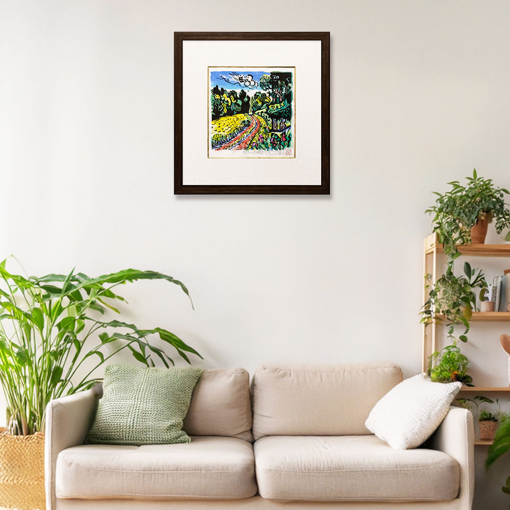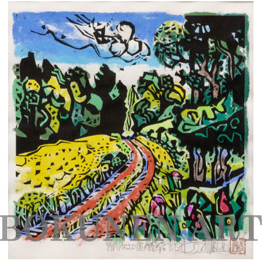 彩色までも版によって行う浮世絵とは違い、ボクネンの手で1点ずつ着色が行われます。そのため、同じ絵柄を何枚も作成できる版画ではあっても、全く同じ色合いの作品はありません。また、和紙の繊維の間から滲み出した色は、表面から直に着色するよりも自然な味わいがあります。
