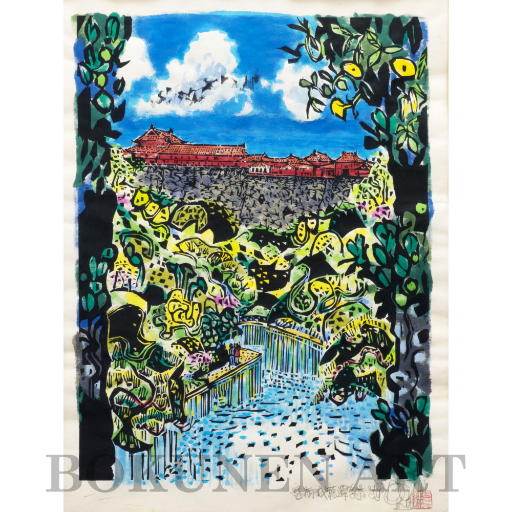 彩色までも版によって行う浮世絵とは違い、ボクネンの手で1点ずつ着色が行われます。そのため、同じ絵柄を何枚も作成できる版画ではあっても、全く同じ色合いの作品はありません。また、和紙の繊維の間から滲み出した色は、表面から直に着色するよりも自然な味わいがあります。